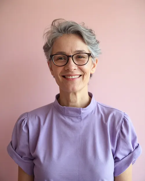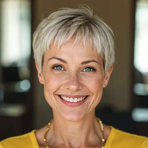 Os cortes pixie ganham mais força e vigor quando os usa num tom vibrante de cinzento-lavanda que realça a sua tez clara. A fabulosa paleta de cores dá ao pixie jovem uma aparência decididamente feminina. A franja, as camadas da coroa desgrenhadas e os lados/cabeça bem cortados mantêm o estilo elegante e limpo.
