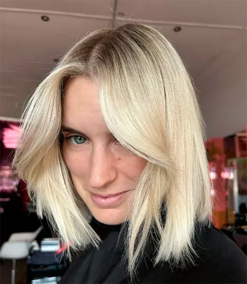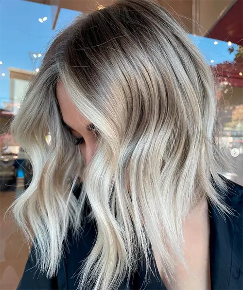 Manter um cabelo loiro brilhante pode ser um desafio, e este penteado apresenta pontas loiras sólidas e mantém uma cor natural clara na raiz para facilitar a manutenção do estilo.